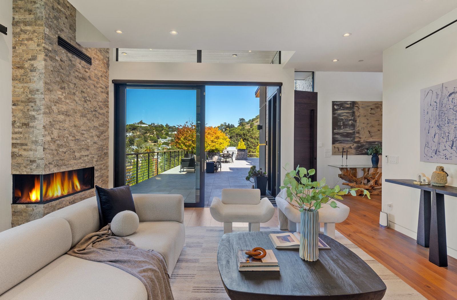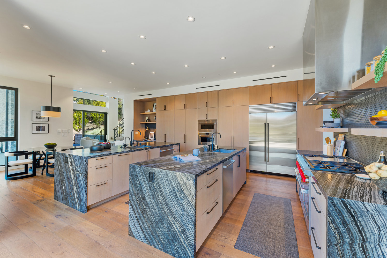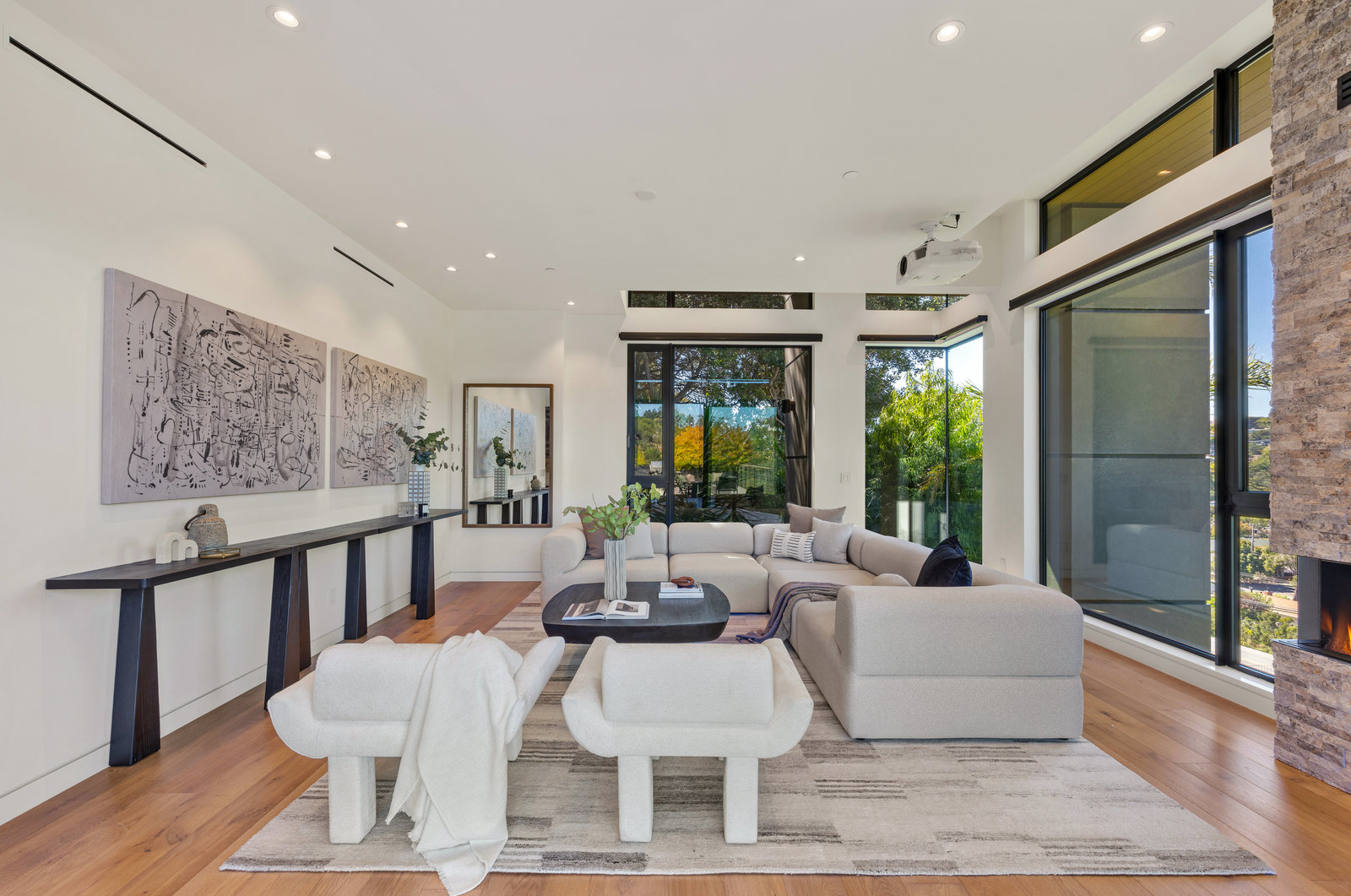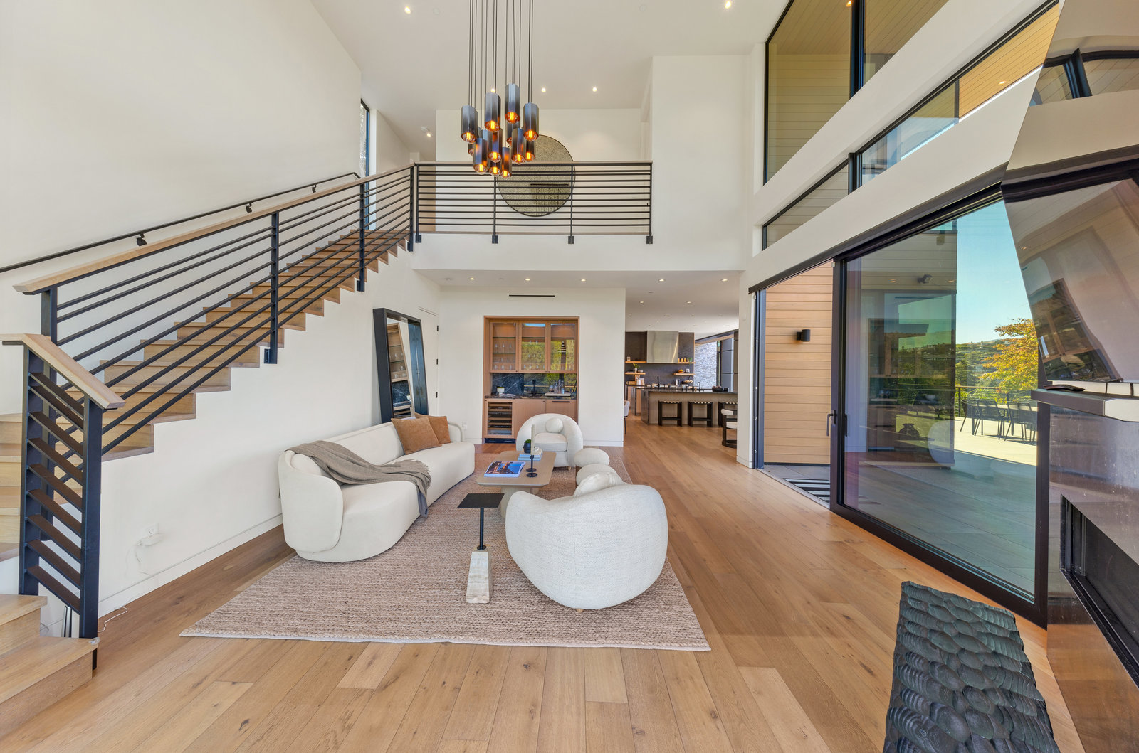The living room opens to a huge entertainment terrace and features walls of windows framing the mountains, 7-inch wide plank white oak flooring, 10-foot ceilings, and a gas fireplace with an intricate travertine stone accent wall.