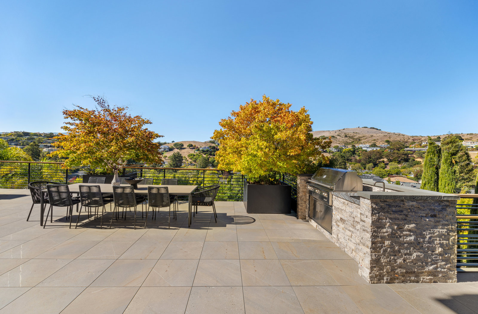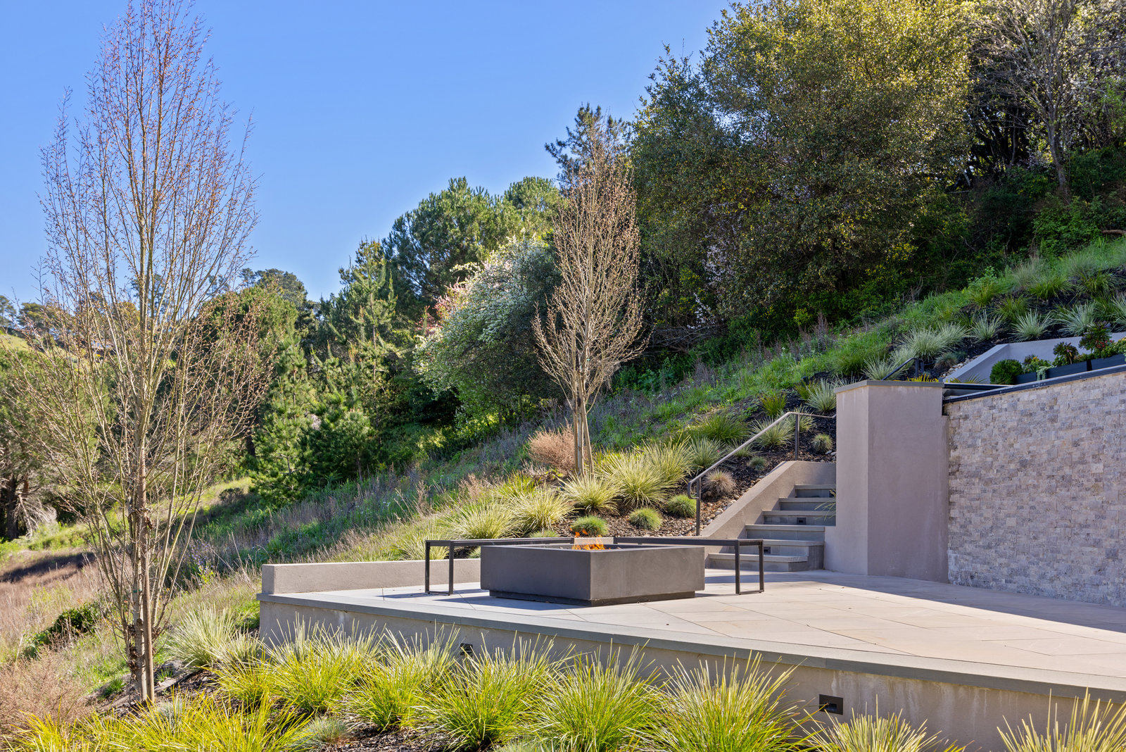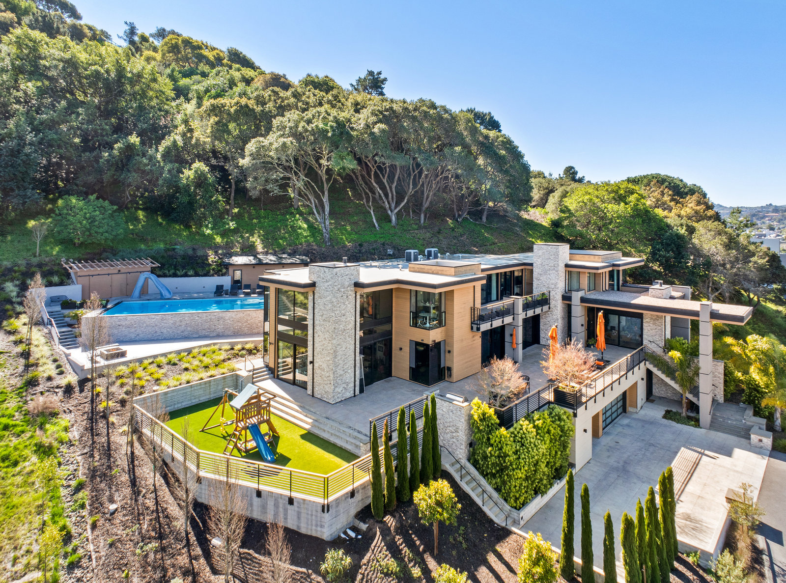 The property’s tiered design maximizes the hillside setting, offering both seclusion and sweeping vistas, with intentional landscaping, curated lighting, and thoughtfully integrated hardscape throughout.