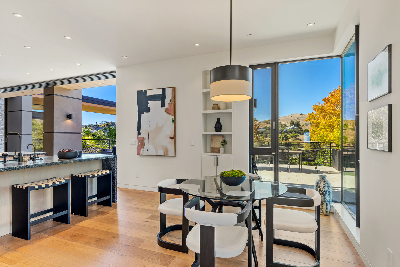 The open and airy dining room is centrally located between the kitchen and living room, providing an ideal layout for grand-scale entertaining, with recessed glass doors opening to the terrace for easy indoor-outdoor living.
