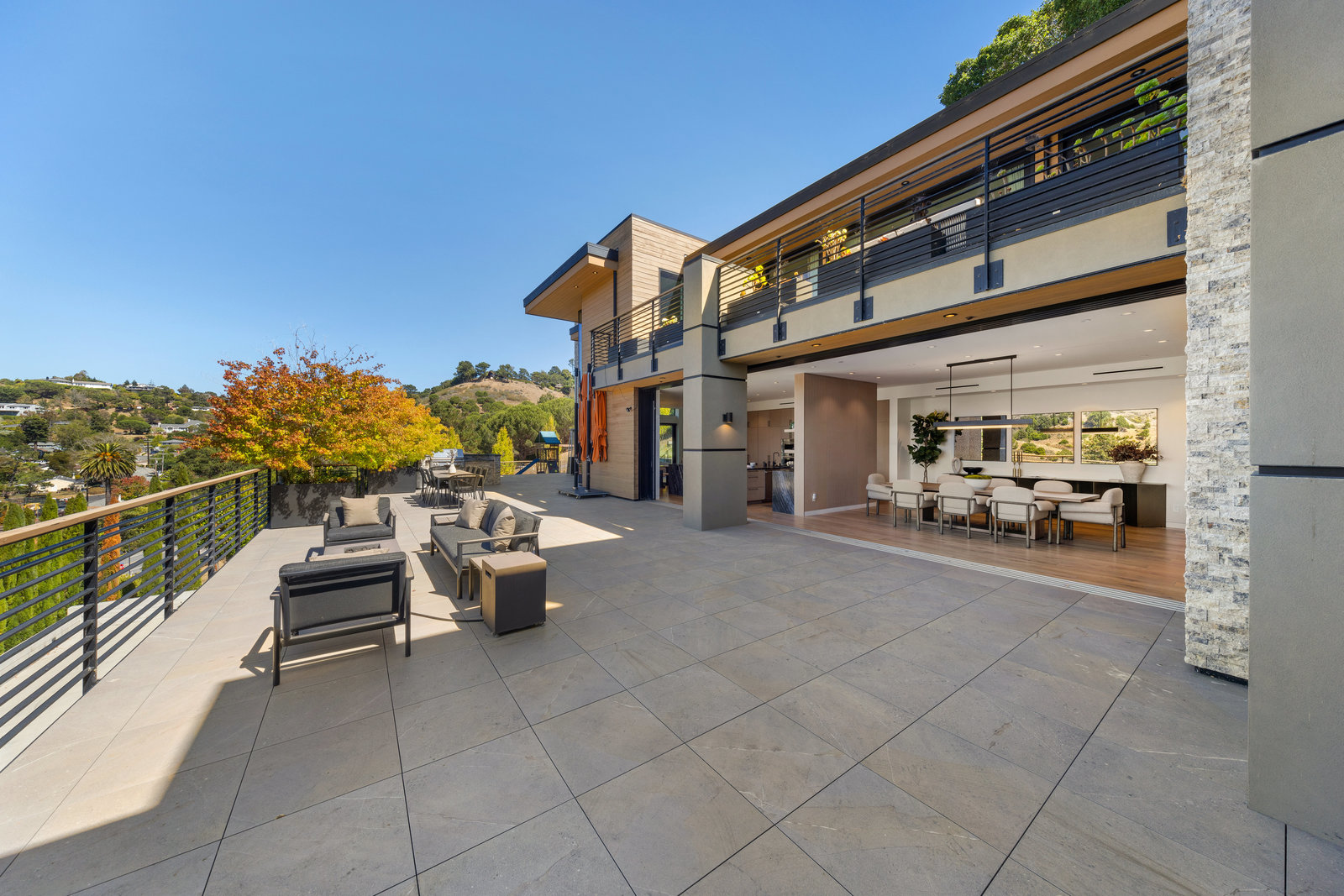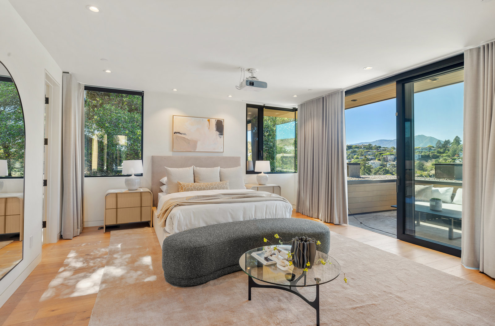 The primary suite boasts a stunning spa-like bath with Calacatta marble, a dual vanity, a Badeloft free-standing tub, and a large shower. This serene retreat opens to a private terrace with west-facing views of Mount Tamalpais.