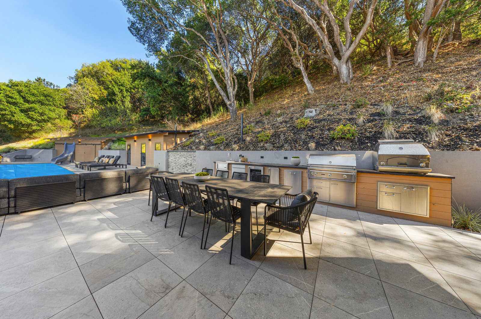 A state-of-the-art outdoor kitchen is fully equipped with stainless steel appliances, multiple grills, beverage refrigeration, and prep space. Just steps away, a shaded dining patio invites leisurely alfresco meals beneath the trees.